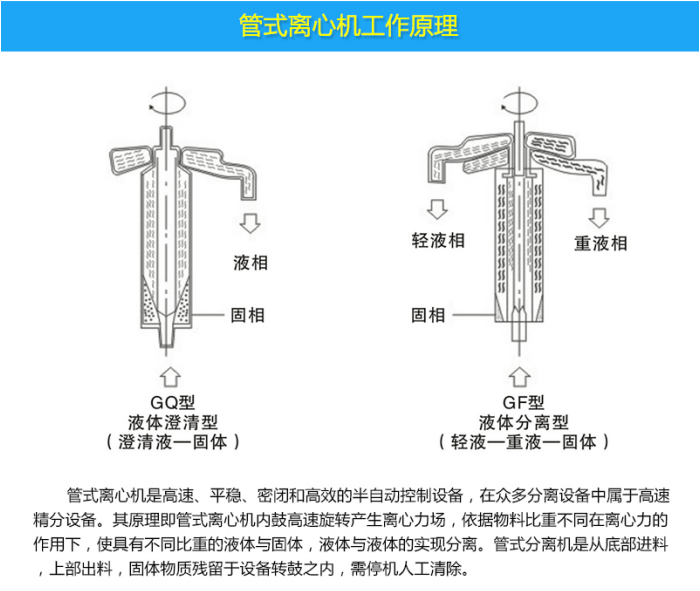 管式離(li)心機是一種高轉(zhuan)速、高分離(li)因數的(de)(de)分離(li)機。通常適(shi)用于固體(ti)(ti)含量(liang)低于1%、固體(ti)(ti)小(xiao)顆粒及(ji)固體(ti)(ti)與液(ye)體(ti)(ti)的(de)(de)密(mi)度差(cha)很(hen)小(xiao)的(de)(de)懸浮液(ye)的(de)(de)澄清;也適(shi)用于輕液(ye)與重液(ye)的(de)(de)密(mi)度差(cha)小(xiao)且(qie)分散(san)性很(hen)高的(de)(de)乳濁液(ye)的(de)(de)分離(li)。